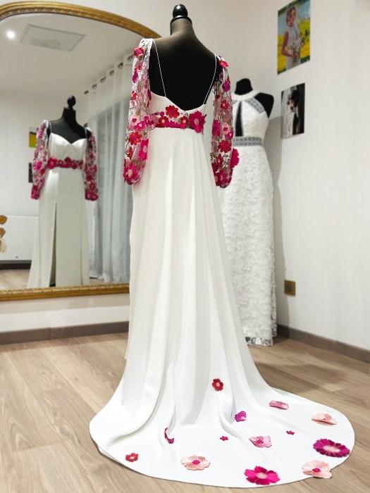 Robe en crêpe ornée de son tulle brodé aux fleurs fuchsia, traîne et manches amovibles, pour changement de style à tout moment de la journée.